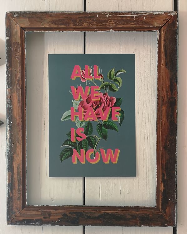 A quirky yet topical print featuring contemporary typography on a traditional botanical background.