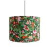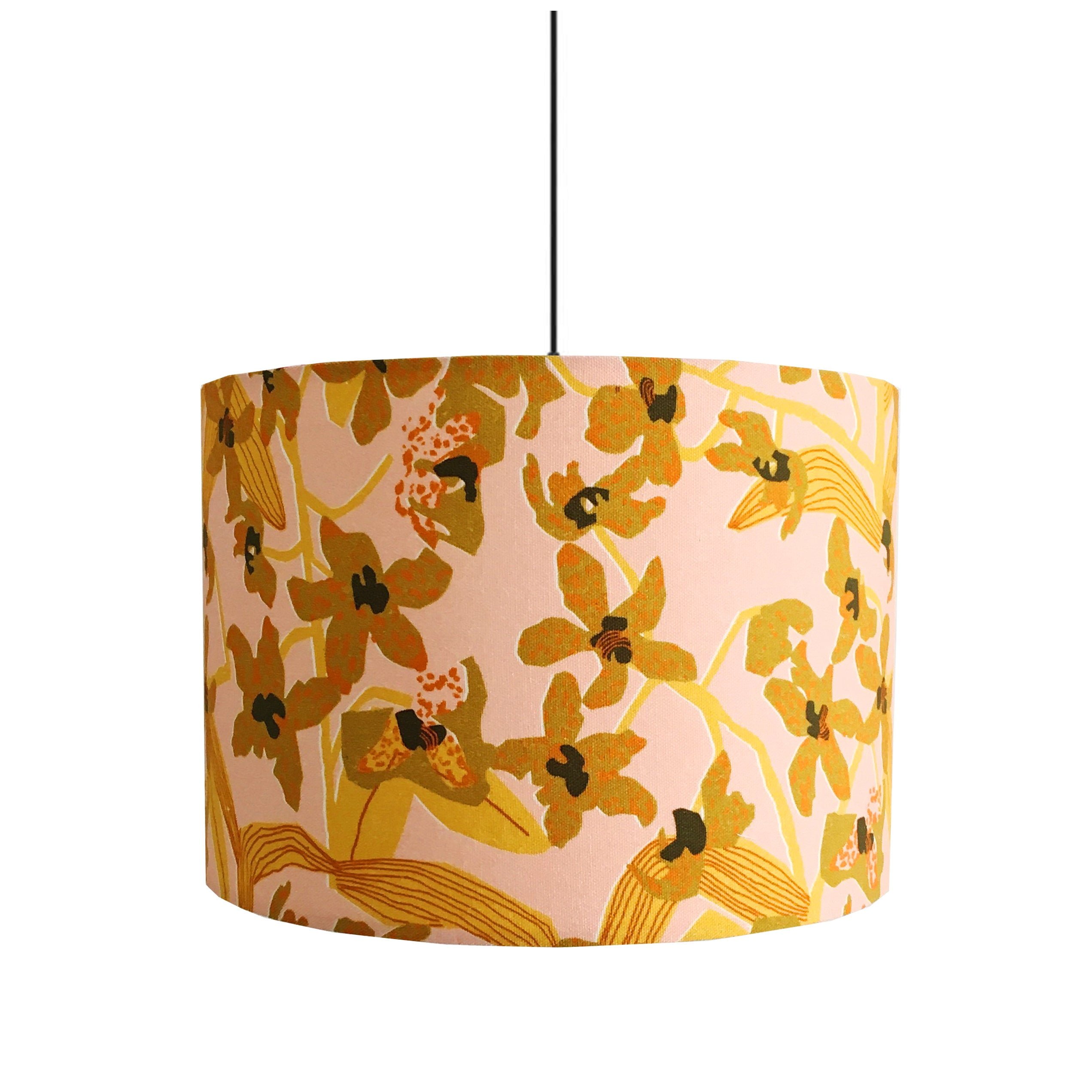 This lampshade uses our fabric Daphne in the mustard colourway and features sensual orchids blooming in the hothouse.