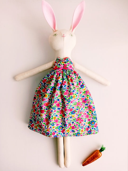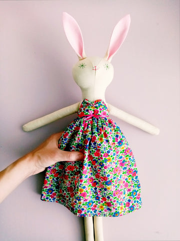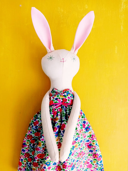 Beautiful handmade Rabbit called Summer, made in Kent by Little Loomers. She is finished with hand embroidered green starry eyes and a bright pink nose.